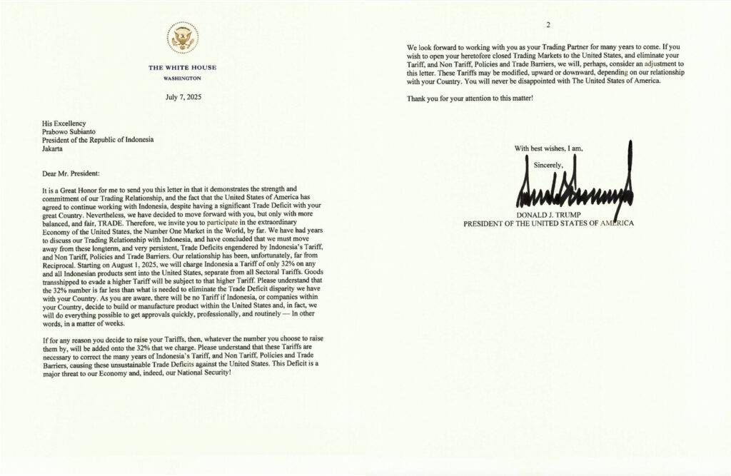 “Mulai 1 Agustus 2025, kami akan mengenakan tarif sebesar 32 persen kepada Indonesia atas semua produk Indonesia yang dikirim ke Amerika Serikat, terpisah dari semua Tarif Sektoral. Barang yang dikirim ulang untuk menghindari Tarif yang lebih tinggi akan dikenakan Tarif yang lebih tinggi tersebut. Harap dipahami bahwa angka 32 persen tersebut jauh lebih kecil daripada yang dibutuhkan untuk menghilangkan kesenjangan defisit perdagangan yang kami miliki dengan Negara Anda,” jelasnya.
