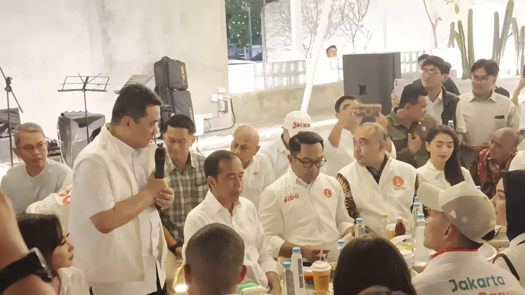 Jakarta – Presiden ke-7 RI Joko Widodo (Jokowi) bertemu dengan calon gubernur Jakarta nomor urut 1, Ridwan Kamil (RK), serta para relawan pendukung Jokowi di Kaizen Coffee, Cempaka Putih, Jakarta, pada Senin (18/11) malam. Pertemuan ini dilakukan sembilan hari menjelang Pilkada DKI Jakarta, yang akan berlangsung pada 27 November 2024.