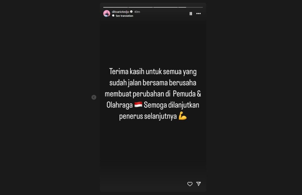 Dalam unggahan di Instagram Stories pada Senin (8/9/2025), Dito menyampaikan rasa terima kasih kepada semua pihak yang telah bekerja sama untuk membawa perubahan di sektor kepemudaan dan olahraga.