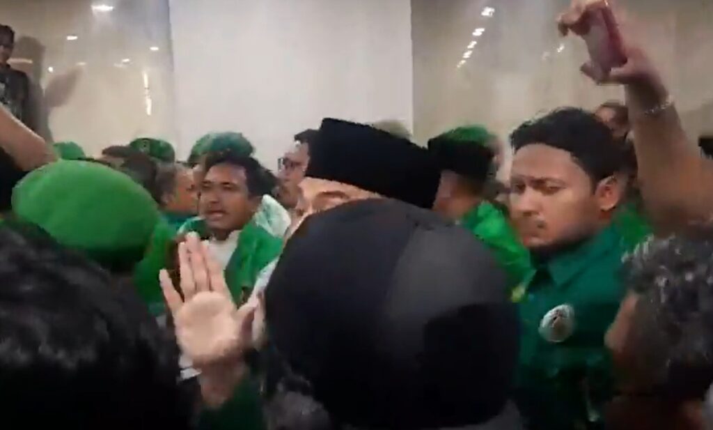 “Woi, ganggu woi! Woi, berhentikan itu, lagi konpers!” jawab kelompok kader lainnya.