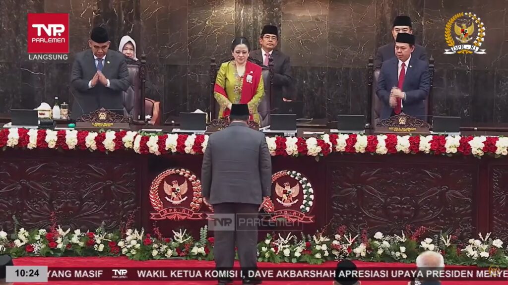Gestur serupa dibalas oleh Muzani, Puan, dan Sultan, yang juga membungkukkan badan sebagai tanda hormat. Setelah itu, Prabowo berbalik menghadap para anggota Dewan yang hadir di ruang sidang.