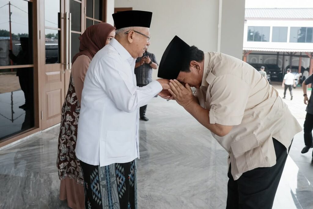 Presiden Prabowo didampingi oleh Menteri Sekretaris Negara (Mensesneg) Prasetyo Hadi dan Seskab Teddy Indra Wijaya, yang juga mengenakan kopiah hitam. Keduanya terlihat mencium tangan KH Ma’ruf Amin dalam suasana silaturahmi tersebut.