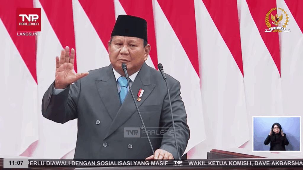 “Saya beri peringatan apakah ada orang-orang besar, orang-orang kuat, jenderal-jenderal dari mana pun. Apakah jenderal TNI atau polisi, atau mantan jenderal, tidak ada alasan, kami akan bertindak atas nama rakyat,” kata Prabowo di hadapan anggota MPR, DPR, dan DPD.