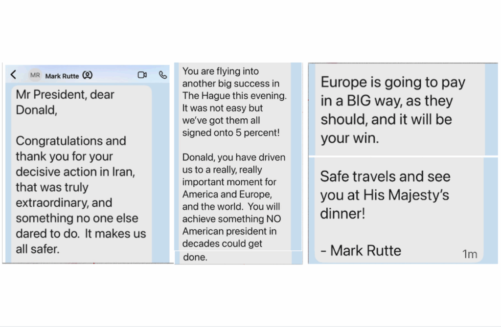 Dalam pesan itu, Rutte memuji langkah Trump atas “tindakan tegas” terhadap Iran, menyebut bahwa Amerika Serikat telah melakukan sesuatu yang belum pernah dilakukan presiden Amerika sebelumnya. Isi pesan tersebut: